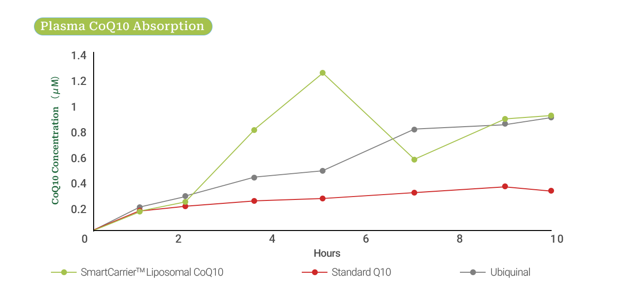 Hình 2: Dữ liệu lâm sàng cho thấy nồng độ CoQ10 trong huyết tương theo thời gian khi so sánh SmartCarrier™ Liposomal CoQ10 (xanh nhạt) với CoQ10 thông thường (đỏ) và Ubiquinol (xám).