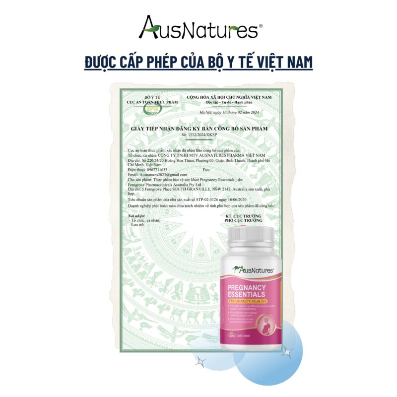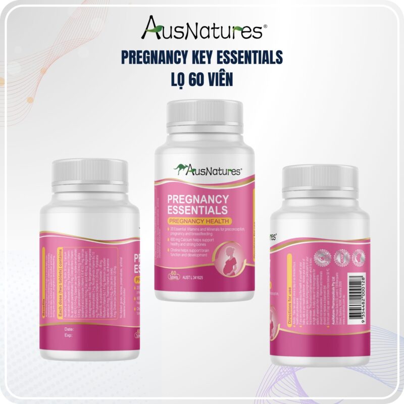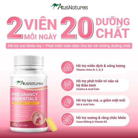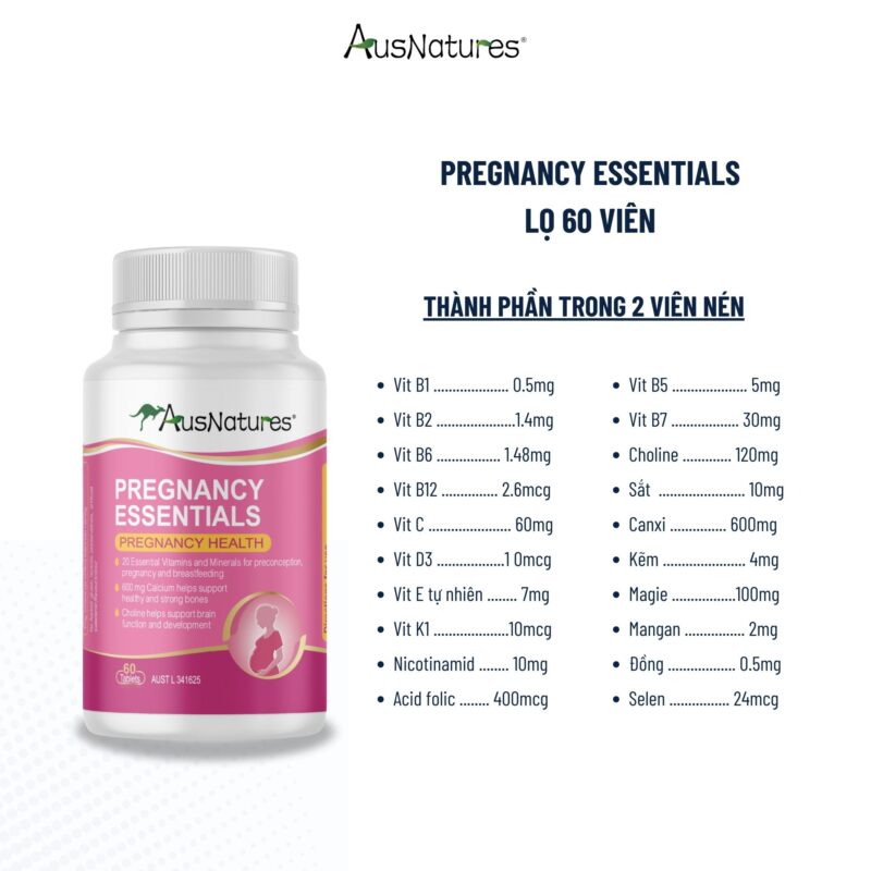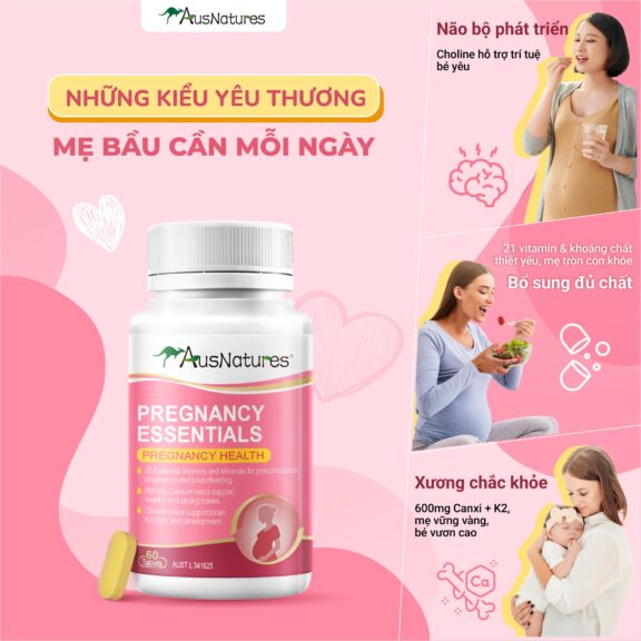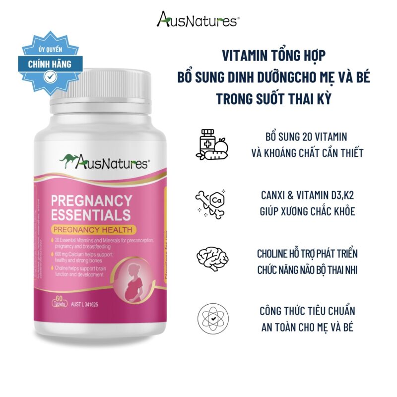 AusNatures Pregnancy Essentials là công thức vitamin tổng hợp cao cấp dành riêng cho phụ nữ mang thai và đang cho con bú. Với 21 loại vitamin và khoáng chất thiết yếu, sản phẩm hỗ trợ toàn diện cho sức khỏe mẹ và bé từ giai đoạn trước thụ thai – trong thai kỳ – sau sinh. Đặc biệt, công thức chứa canxi, vitamin K2 và choline giúp phát triển não bộ thai nhi, xương chắc khỏe và cải thiện chức năng miễn dịch.