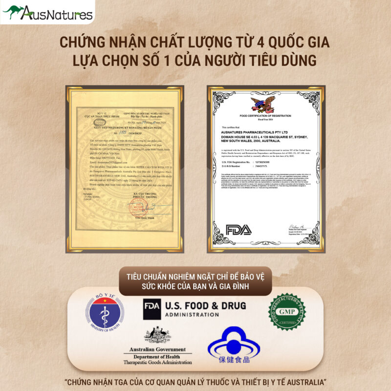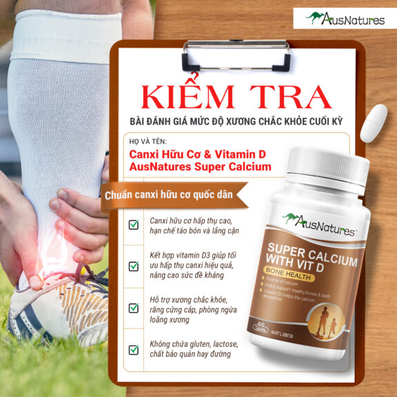 AusNatures Super Calcium With Vit D là thực phẩm bổ sung canxi hữu cơ cao cấp, kết hợp giữa canxi citrate dễ hấp thu và vitamin D3 – hỗ trợ xây dựng và duy trì hệ xương, răng chắc khỏe. Sản phẩm phù hợp cho người lớn tuổi, phụ nữ mang thai, trẻ em và người ăn uống thiếu canxi hoặc ít tiếp xúc ánh nắng.